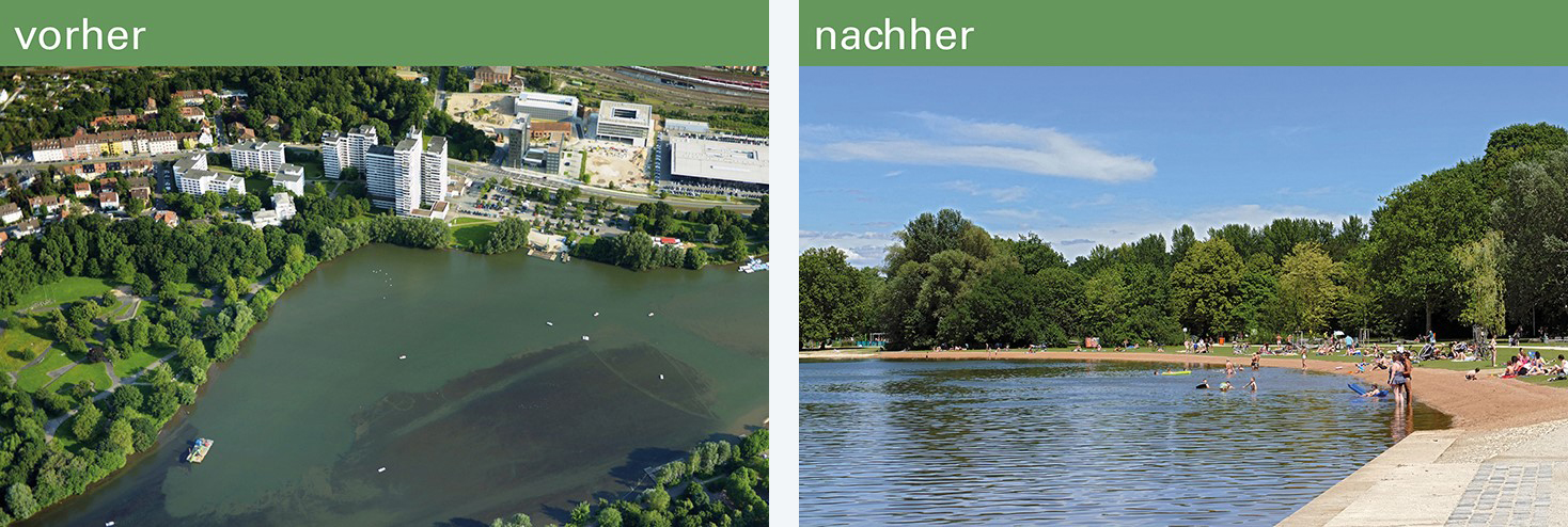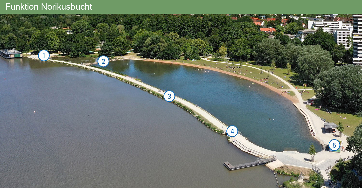 Die „Norikusbucht“ ist die zentrale Wasserbaumaßnahme, um die Fließgeschwindigkeit im Unteren Wöhrder See zu erhöhen und somit Ablagerungen zu verhindern. Zudem wurde hier mitten in der Stadt ein naturnaher Badebereich geschaffen, der von den Nürnbergern mit Begeisterung angenommen wird.